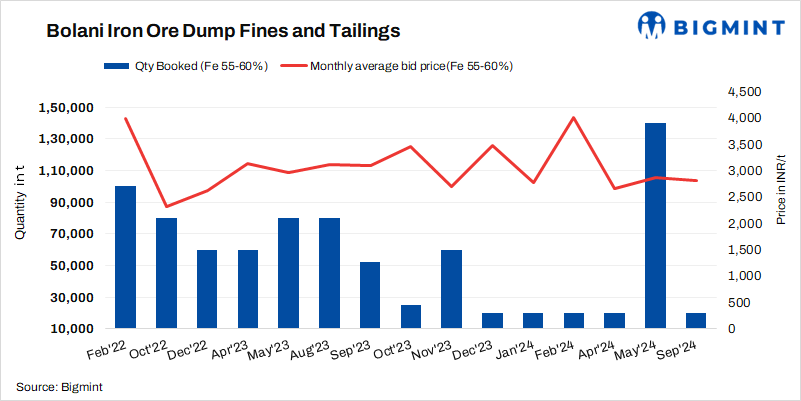 Steel Authority of India Ltd (SAIL) conducted an auction for 44,000 t of iron ore dump fines (Fe 55.30-58.40%) from Bolani mines, Odisha on 30 Sep’24. Only 20,000 t of dump fines (Fe 58.4%) were booked at INR 2,800/t against the base price of INR 2,650/t. Notably, bid prices were higher by INR 150/t. Price is on ex-mines basis, including royalty, DMF, NMET and extra premium.