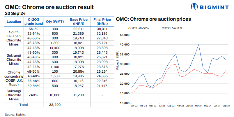 At the OMC chrome ore auction, 22,400 t were sold. Bid prices rose 5.63-21% (INR 1,457-4,088/t) for grades below 50%, but remained largely stable for grades above 52% against last month. Premiums of 16.74-71.14% (INR 3,200-15,800/t) were secured over the set base price.