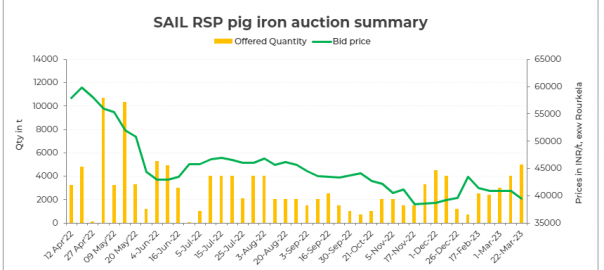 SAIL-Rourkela Steel Plant (RSP) conducted an auction for 5,000 t of steel grade pig iron on 22 Mar’23. Of this, 2,500 t (50%) was booked at INR 39,480/t exw, sources informed. Bids dropped INR 520/t compared to the last auction on 16 Mar’23, at which 3,300 t was booked, out of 4,000 t on offer, at an average price of INR 40,000/t exw.