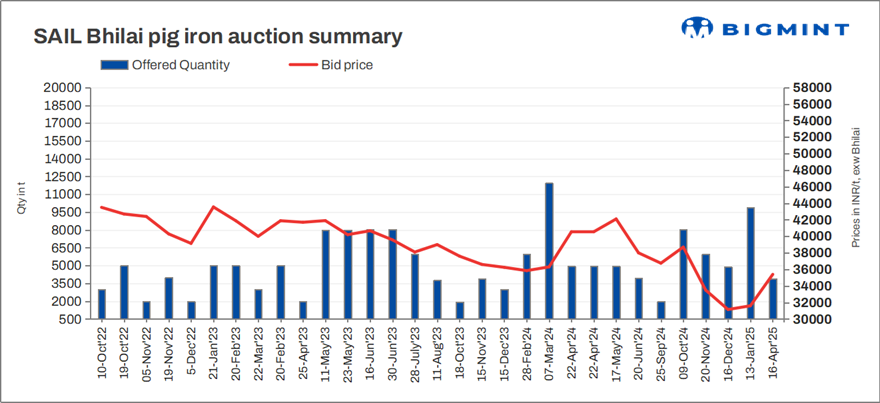 SAIL-BSP held an auction for 3,900 t of steel-grade pig iron on 16 Apr’25, in which the entire quantity was booked at an average price of INR 35,400/t exw. In the previous auction, conducted on 13 Jan’25 for 9,880 t of steel-grade pig iron, the entire volume was booked at an average price of INR 31,600/t exw.