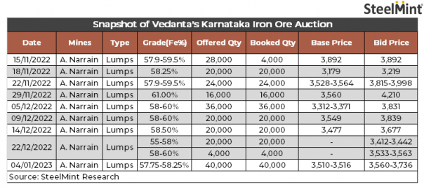 Vedanta had conducted an auction for 40,000 t of iron ore lumps (6-40 mm, Fe57.75-58.25%) from its A. Narrain mines in Karnataka’s Chitradurga district on 4 Jan’23. According to sources, the entire material was sold at INR 3,560-3,736/t against the base price of INR 3,510-3,516/t. Prices were exclusive of royalty, DMF, and NMET charges.