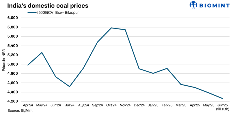 Domestic coal prices remained under pressure this week amid sluggish demand and sufficient availability. As per BigMint’s assessment, the 5000 GCV grade declined by INR 50/t to INR 4,700/t exw-Bilaspur, while the 4500 GCV grade remained stable at INR 4,250/t. Bids have come down further in recent SECL auctions, reflecting limited buying interest.