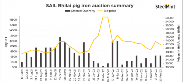 SAIL-Bhilai Steel Plant (BSP) held an auction for 5,000 t of steel grade pig iron on 20 Feb’23. The entire quantity was booked at an average price of INR 41,885/t exw, sources informed. The management’s approval is expected today.