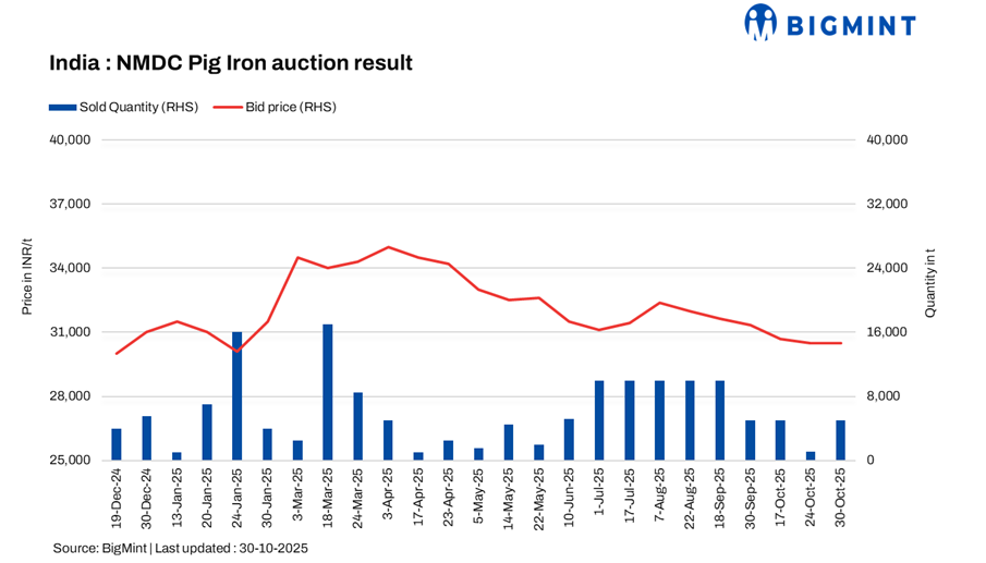 NMDC’s steel plant in Nagarnar, Chhattisgarh, auctioned 5,000 t of steel-grade pig iron on 30 Oct’25, with the entire quantity booked at an average price of INR 30,500/t (by road). However, management approval is still pending. Bids were stable compared to the previous auction on 24 Oct, which saw an average price of INR 30,500/t (by road).