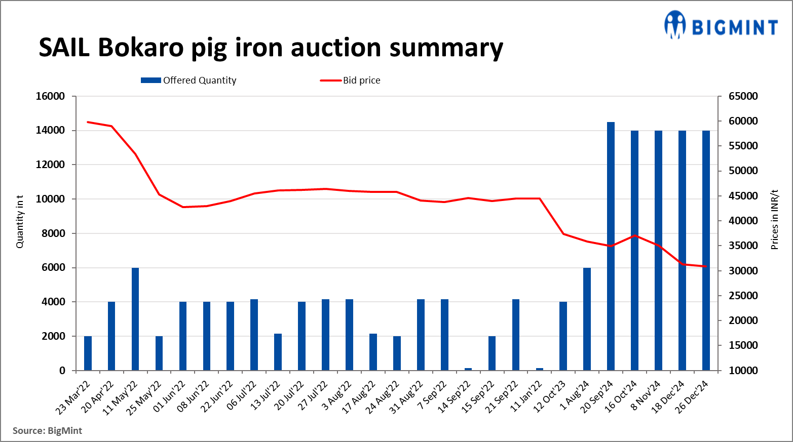 SAIL-Bokaro Steel Plant (BSL) held an auction for 14,000 t of steel-grade pig iron on 26 Dec’24. Out of the total volume, 7,000 t were booked at an average price of INR 30,900/t exw.