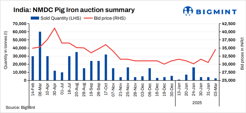 NMDC’s steel plant in Nagarnar, Chhattisgarh, conducted an auction for 15,000 t of steel-grade pig iron (for road transport) on 24 Mar’25. Of the total offered quantity, 8,500 t were booked at the base price of INR 34,300/t. At the previous auction, out of the 20,000 t on offer, 17,000 t were booked at the base price of INR 34,000/t.