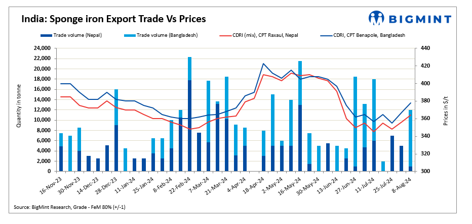 Sponge iron export offers have risen further this week by $8-11/t. Despite some activity, overall demand remains moderate. Slight price increase is attributed to varying demand dynamics and market conditions. However, weak demand persists due to ongoing internal disturbances in Bangladesh. Approximately 12,000 t of sponge iron deals were tracked, with prices ranging between $363-$365/t CPT Raxaul and $377-$380/t CPT Benapole.