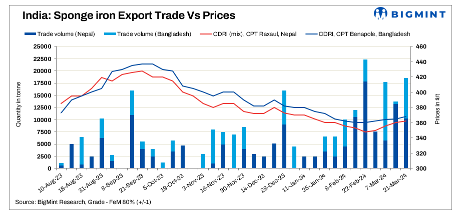 BigMint’s weekly price assessment increased by $2/t to $362/t CPT Nepal for FeM 80% (70:30 Mix). Offers for Bangladesh also rose by $3/t to $368/t CPT Benapole. Three rakes (7,600 t) of sponge iron were sold at $336-338/t, LTW in eastern India, equivalent to $360-362/t CPT Nepal. Additionally, about 2,600 t of PDRI sponge (78-79% FeM) for Nepal were sold by road at $310/t ex-mill in eastern India. Furthermore, approximately 8,300 t of sponge iron were sold to Bangladesh at around $365-368/t CPT Benapole.