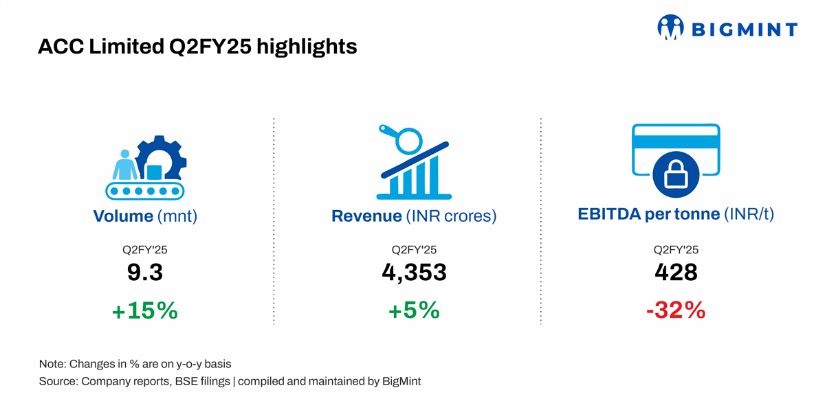 Adani Cement’s ACC Limited reported a 15% growth in sales to 9.3 mnt in Q2FY’25 from 8.1 mnt in Q2FY’24. Meanwhile, the same dropped 9% from 10.2 mnt in Q1FY’25. Revenue rose 5% to INR 4,353 crores in Q2FY’25 from INR 4,152 crores in the CPLY. Meanwhile, the same fell 10% from INR 4,853 crores in the previous quarter. EBITDA/t declined 32% to INR 428/t in Q2 against INR 631/t in the CPLY.
