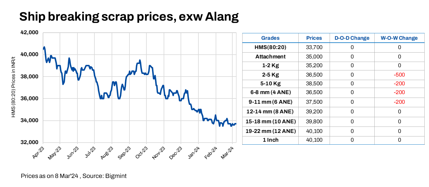 Prices for ship-breaking melting scrap in Alang, Gujarat, stayed unchanged for the fourth consecutive day as per the assessment by BigMint on 8 March’2024. HMS (80:20) prices remained at INR 33,700/t ex-yard. Semi-finished and finished steel segments reported an average demand level in the region’s trading session yesterday, resulting in stable offers from scrap suppliers today.