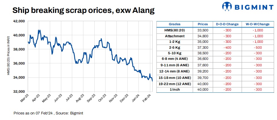 Ship-breaking melting scrap prices in Gujarat’s Alang market decreased by INR 300/t d-o-d on 7 Feb’24, as per BigMint’s assessment. HMS (80:20) prices were assessed at INR 33,500/t exy. Semi-finished steel prices fell by around INR 300-500/t in the region in yesterday’s trading session along with disparity in bids and offers for scrap prompted suppliers to lower their offers today.