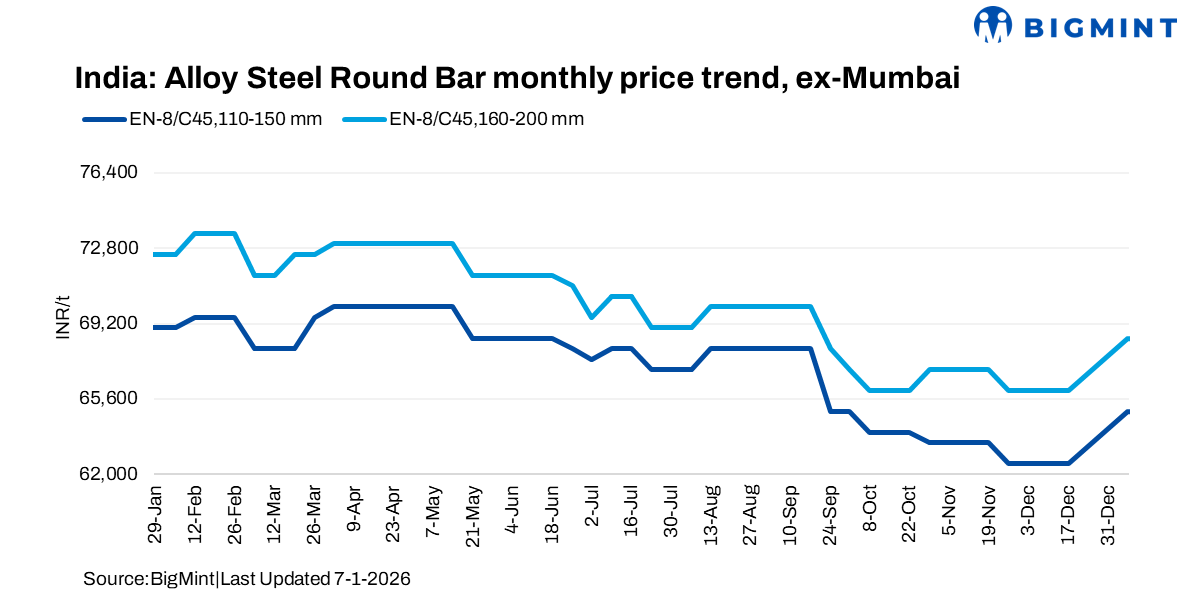 Domestic prices of alloy steel round bars of grades EN-8/C45 (110-150 mm) and EN-8/C45 (160-200 mm) rose by INR 2,500/t w-o-w to reach INR 65,000/t ($723/t) and INR 68,500/t ($762/t) ex-works, respectively, as assessed on 7 Jan’26. The market witnessed positive sentiments, supported by balanced supply and demand, with sentiment improving since last week. M-o-m, too, prices recorded an upward movement.