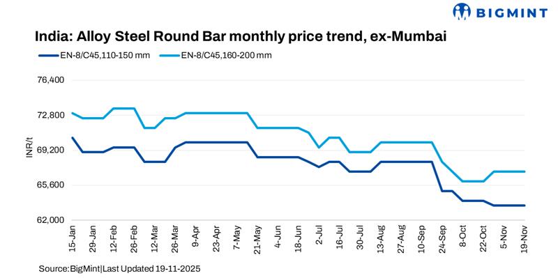 Indian alloy steel round bar (EN-8/C45, 110-150 mm and EN-8/C45, 160-200 mm) prices remained unchanged w-o-w at INR 63,500/t ($717/t) and INR 67,000/t ($757/t) ex-works, respectively. The market was stable, supported by steady production and improved demand, driven by the automotive and construction sectors. However, on an m-o-m basis, prices declined.