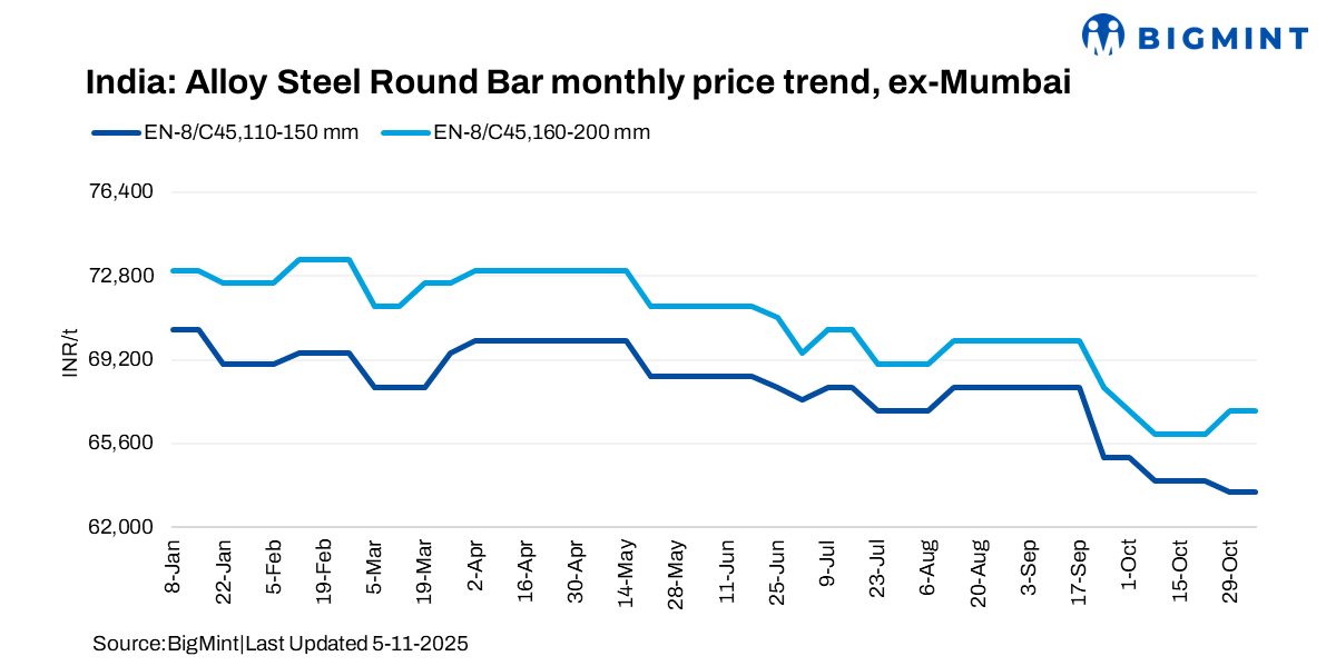 Indian alloy steel round bar (EN-8/C45, 110-150 mm and EN-8/C45, 160-200 mm) prices remained unchanged w-o-w at INR 63,500/t ($716/t) and INR 67,000/t ($755/t) ex-works, respectively. The market was stable, supported by balanced supply and demand, with sentiment improving slightly from the previous week. However, on an m-o-m basis, prices declined.