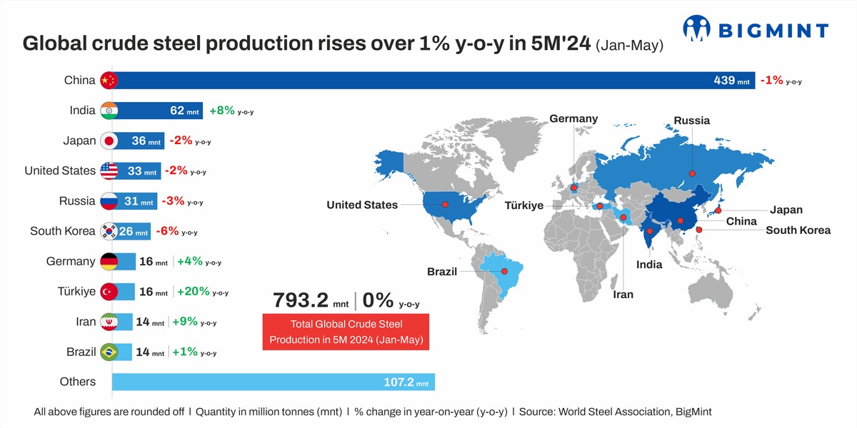 Morning Brief: Global crude steel production rose 1.5% y-o-y to 165.1 million tonnes (mnt) in May 2024, as per worldsteel data. Of the top five producing countries, only India showed an increase over January-May, 2024 while five of the top ten showed a y-o-y decline in this period.