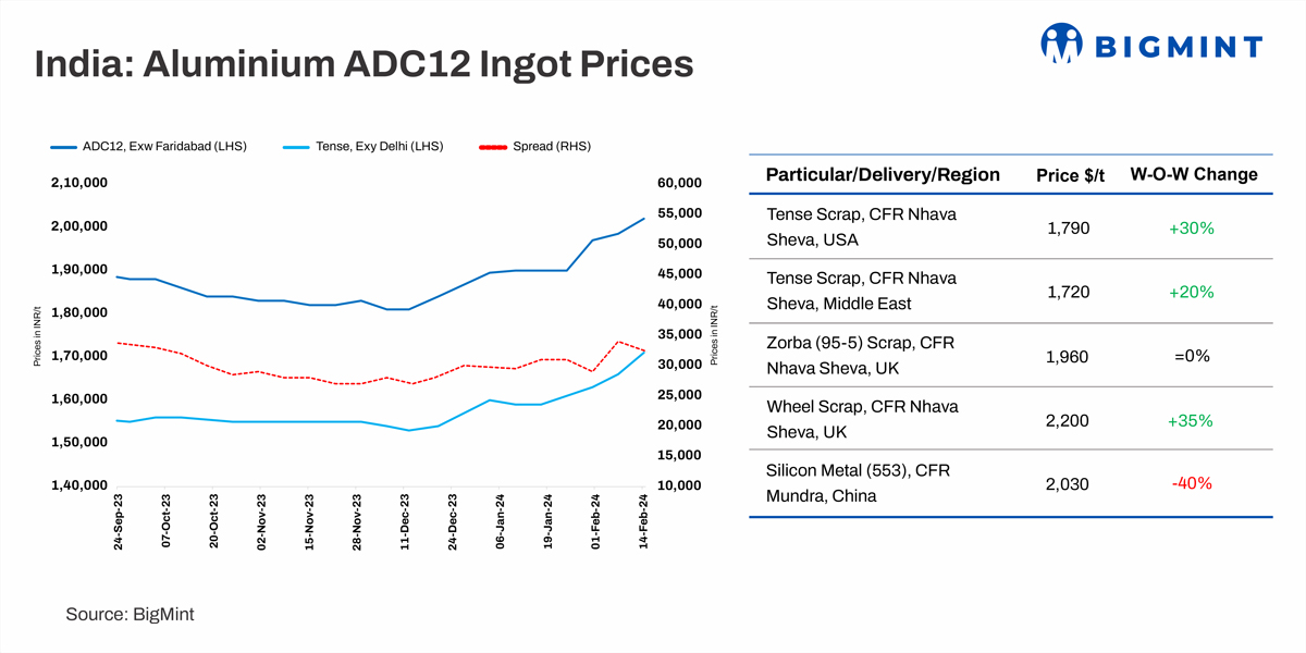 Aluminium ADC12 alloy ingot (automobile equivalent) spot prices rose by INR 3,500/t w-o-w to INR 202,000/t exw Delhi, excluding GST. The uptick is largely attributed to the surge in local Tense scrap prices amid shortage in north as well as south India, as per BigMint’s assessment.