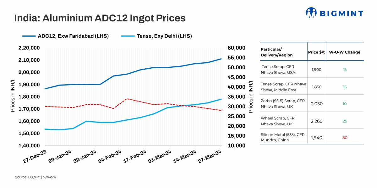 Aluminium ADC12 alloy ingot (automobile equivalent) spot prices increased marginally by INR 3,000/t to INR 211,000/t w-o-w exw Delhi, excluding GST.