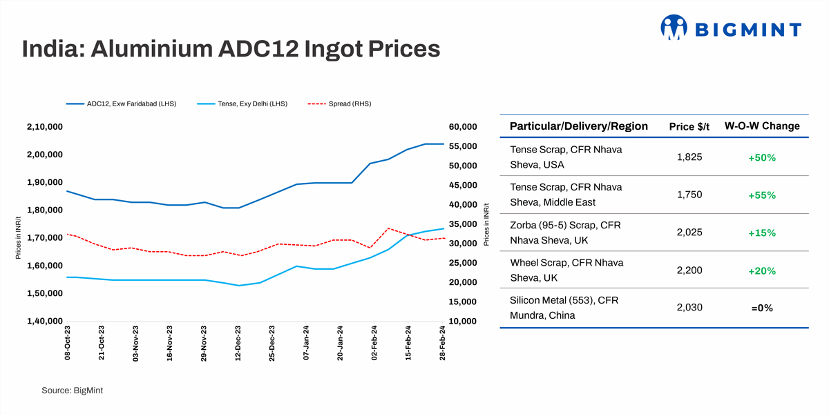 Non-automotive buyers are facing challenges in purchasing ADC12 due to limited availability in the market. Furthermore, bookings made for imported material during January-February’24 are yet to be delivered and are expected to arrive around May. This delay raises concerns about a potential shortage in March, contributing to a further increase in prices, an ADC12 producer based in south India said.