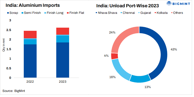 In 2023, India witnessed a 6.9% y-o-y increase in aluminium imports, reaching 2.62 mnt from 2.45 mnt in 2022. The USA led with 1.07 mnt, trailed by China (0.54 mnt) and the UK (0.36 mnt). Arrivals in Nhava Sheva Port were the highest, with a volume of 0.57 mnt, followed by Gujarat (0.43 mnt) and Chennai (0.33 mnt). Notably, scrap imports rose to 1.85 mnt from 1.75 mnt in 2022.