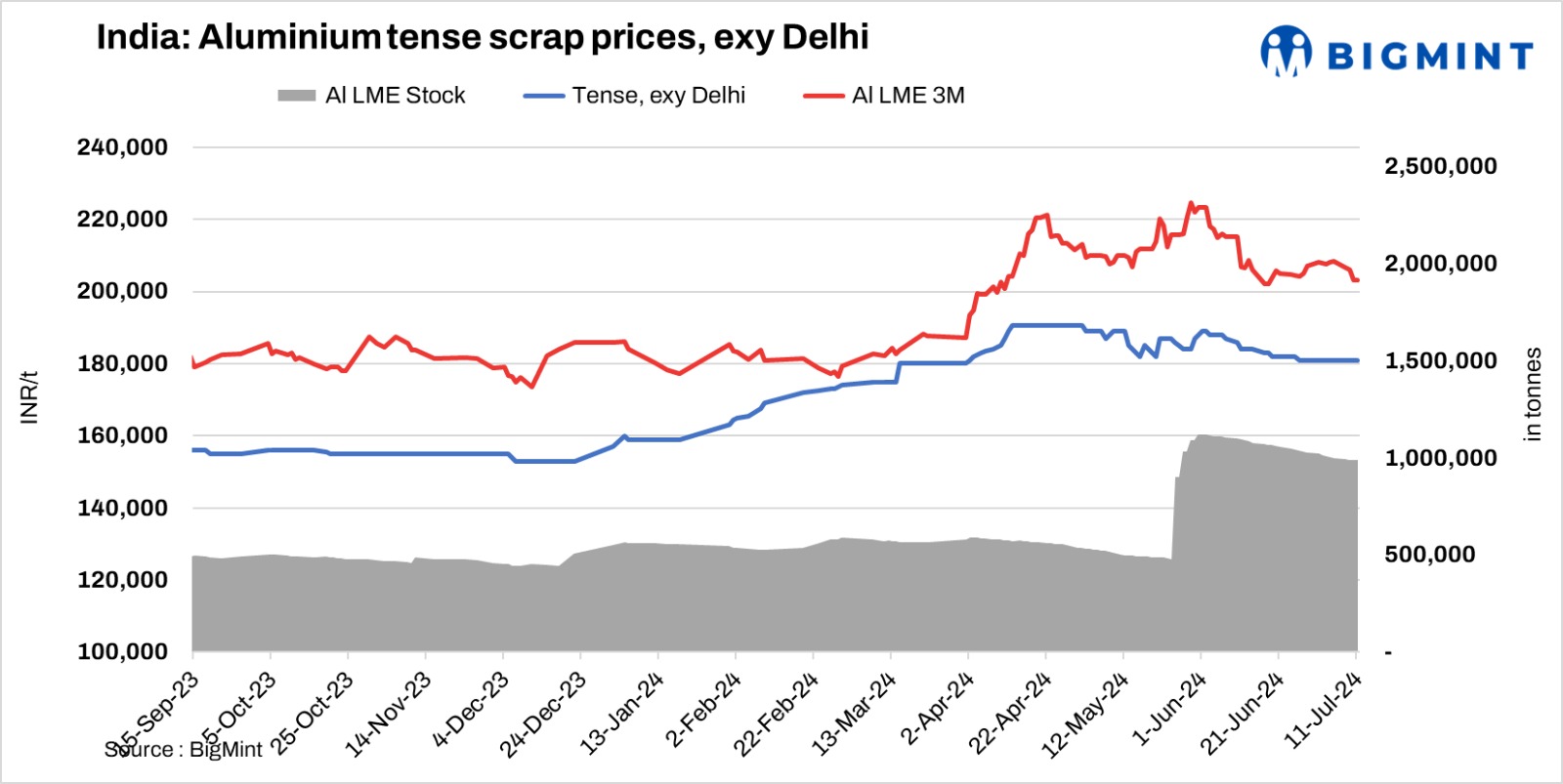 Aluminium scrap prices remained range-bound today. Tense prices stood at INR 181,000/t ex-Delhi. LME futures were at $2,500/t. In the imported segment, UK wheels were heard offered at $2,400/t CFR Mundra. Shredded taint tabor (1-2% UK) traded at $2,070/t and aluminium TT HRB 3% Peru origin traded at $2,010/t CFR Mundra recently.