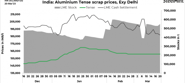Domestic aluminium scrap prices moved down d-o-d today even as LME three-month futures rebounded to settle at $2,274/t at the reporting time. Prices of tense stood at INR 161,000/t ($1,950/t), extrusion at INR 176,000/t ($2,132/t) and utensil at INR 170,000/t ($2,060/t), all exy. Market participants said that transactions remained low-to-moderate and there is slight selling pressure owing to weak global sentiments.