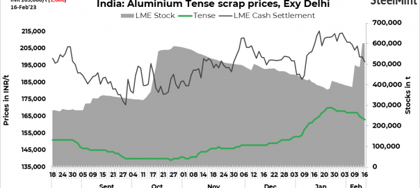 - India’s domestic aluminium scrap prices edged lower d-o-d today due to falling futures and consistent price declines by primary producers.