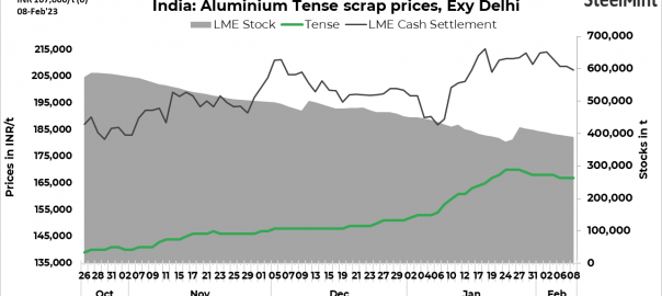 • As per SteelMint’s assessment, tense scrap prices stood at INR 167,000/t ($2,023/t), utensil grade at INR 175,000/t ($2,120/t) and extrusion grade at INR 181,000/t ($2,192/t). Prices are on ex-Delhi basis.