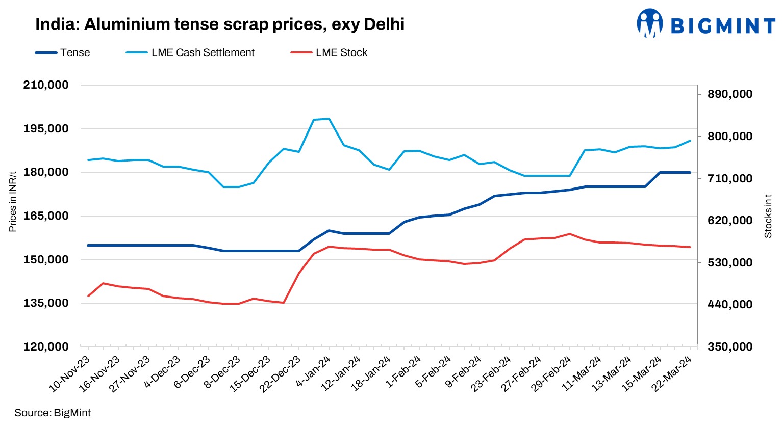 India’s aluminium scrap market prices remained stable towards the end of the week, with a slight shortage of tense scrap and primary player increasing prices. Tense scrap prices reached INR 180,000/t, while utensil scrap stood at INR 172,000/t ex-Delhi. USA-origin aluminium talk was heard procured at 53.5% LME cash price CIF west coast recently. LME future prices fell slightly by 0.5% to $2,290/t at the time of reporting.
