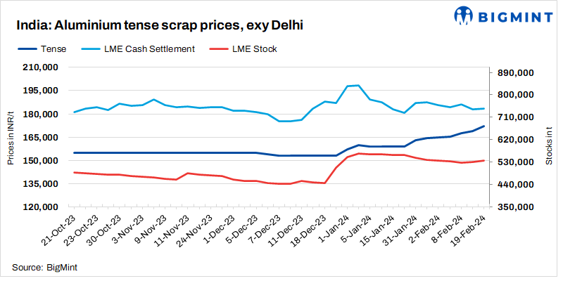 India’s aluminium scrap market prices remained stable towards the start of the week, with a slight shortage of tense scrap and extrusion scrap witnessing limited demand in the market. Tense scrap prices reached INR 172,000/t, while utensil scrap stood at INR 168,000/t ex-Delhi. LME future prices fell slightly by 0.3% to $2,211/t at the time of reporting.