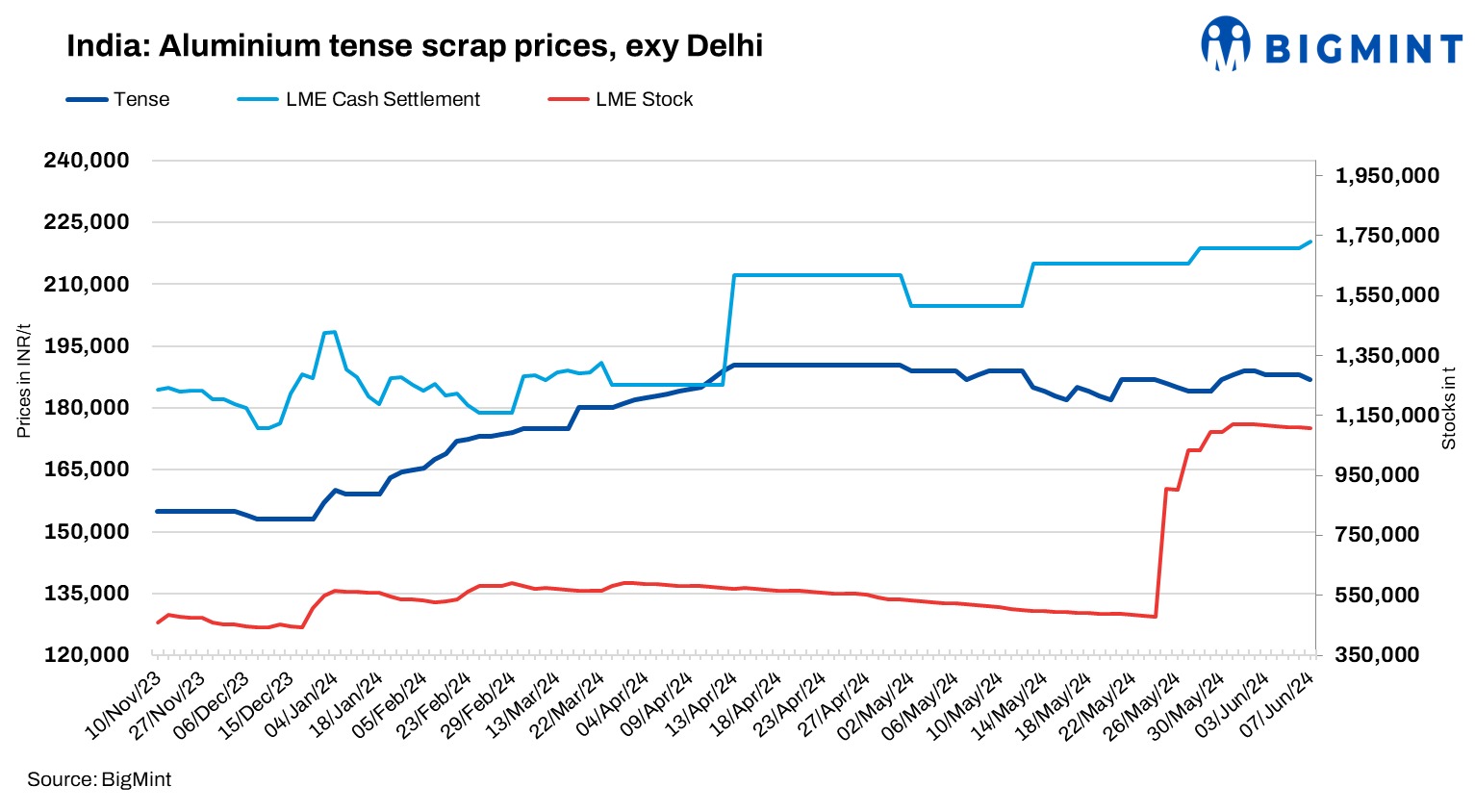 Aluminium scrap prices remained range-bound today. Tense prices and trades were at INR 187,000/t ex-Delhi. LME futures were at $2,630/t. Easing of imported supply tightness reverted imported and domestic prices. In the imported segment, Europe-origin alternator starter heard offered at $2,000/t CIF Mundra. Aluminium extrusion was traded at INR 194/Kg ex Delhi.