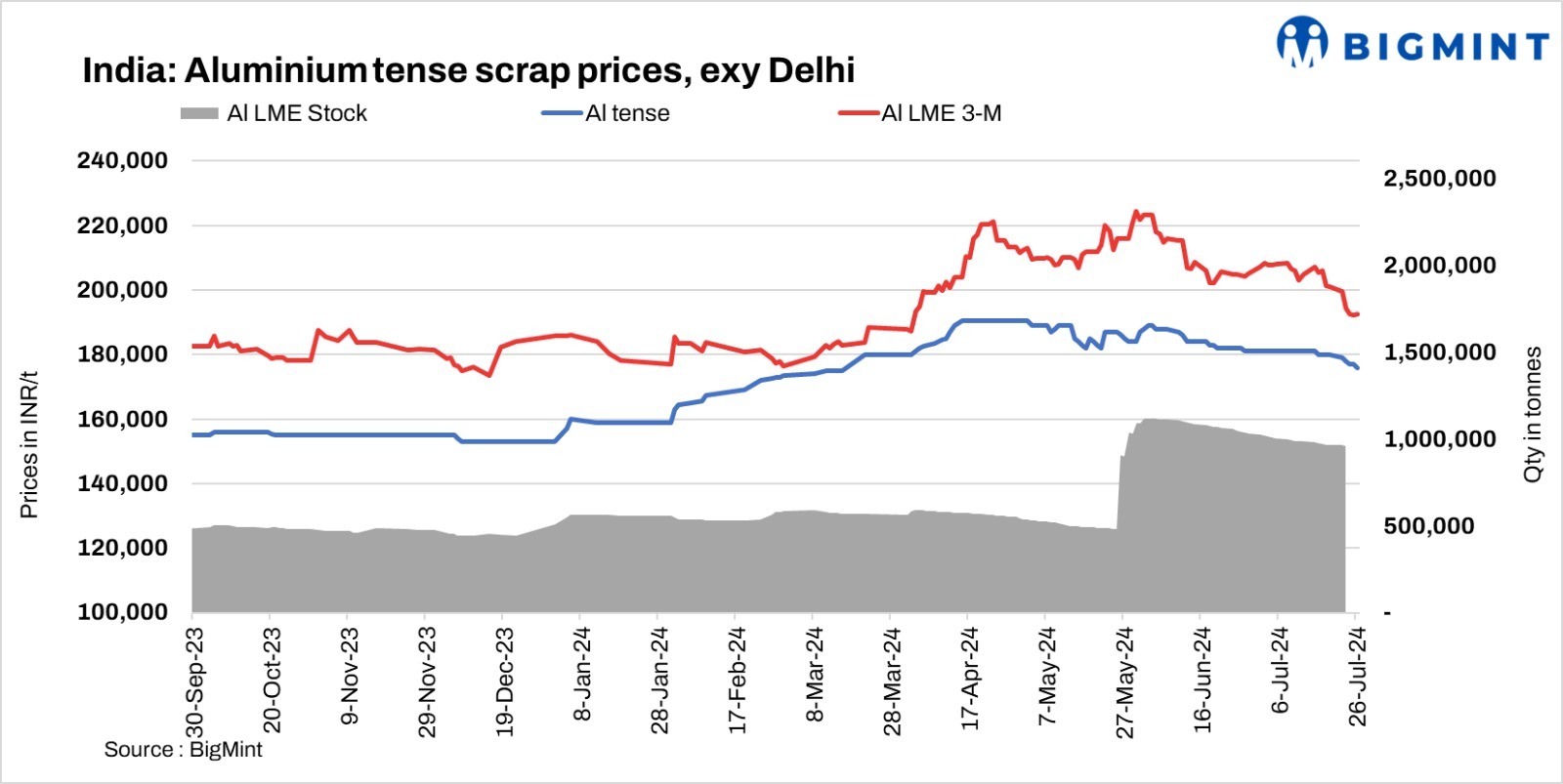 Aluminium scrap prices remained range-bound d-o-d today. Tense scrap was at INR 176,000/t ex-Delhi. LME futures were at $2,290/t, Demand in the domestic market remained slow. In the imported segment, taint tabor shredded 1-2% from UK traded at $1,935/t CFR West coast. Offers for UK wheels were heard at 2,270-2,280/t CFR west coast. Additionally, The import scrap volume dropped to 809,102 t in H1CY’24 in comparison with H1CY’23 at 874,868t.