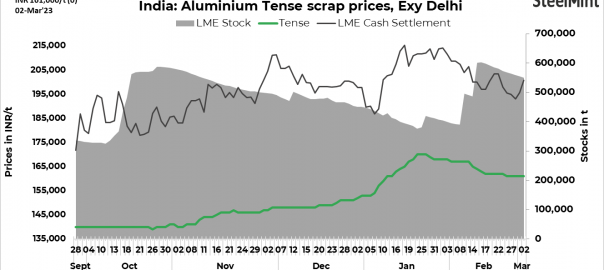 Aluminium scrap prices in India stayed steady on 2 Mar’23, with tense priced at INR 161,000/t ($1,950/t) and utensils at INR 172,000/t ($2,083/t) exy, excluding GST. LME futures rose by 2.47% to $2,431/t, but prices remained unchanged. Sources noted a rise in the supply of tense in the northern region market, suggesting that primary players may soon reduce prices owing to fluctuations in the exchange market.