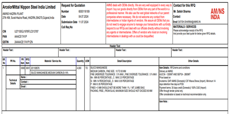 ArcelorMittal Nippon Steel India Ltd. (AM/NS India Ltd.) has floated a supply tender for 4,000 t of medium carbon silico manganese (10-50 mm, Mn min: 60%) for its Hazira plant in Gujarat’s Surat. The bid submission date is 11 Jul’24. The delivery for 1,200 t is scheduled for August and 2,800 t for September, while the payment terms include 30 days’ credit.