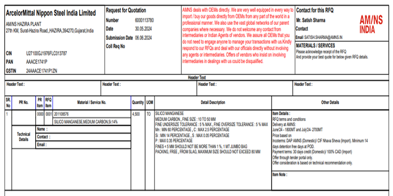Leading integrated western India-based steelmaker, ArcelorMittal Nippon Steel India Ltd. (AM/NS India Ltd.), has floated a purchase tender for 4,500 t of medium-carbon silico manganese (10-50 mm, Mn min: 60%) for its Hazira plant in Gujarat’s Surat. The bid submission date is 6 Jun’24. The delivery for 1,800 t is scheduled for Jun and 2,700 t for Jul, while the payment terms include 30 days’ credit.
