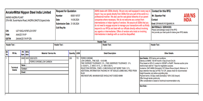 ArcelorMittal Nippon Steel (AM/NS) India has issued a purchase tender for 200 t of low-carbon (LC) ferro chrome (Cr: 60-65%, C: 0.15% max, 10-50 mm) for its Gujarat-based plant. Last date for submission of bids is 21 Aug’24. BigMint assessed LC ferro chrome (Cr: 60%, C: 0.1% max, 10-60 mm) prices at INR 219,000/t exw-Durgapur on 14 Aug’24.