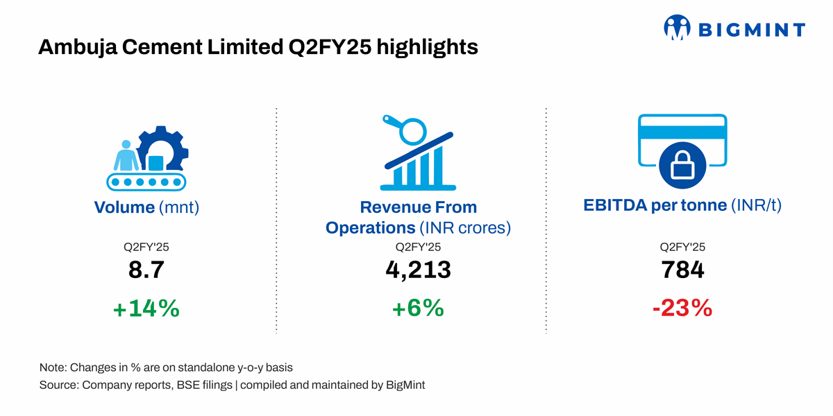 Ambuja Cement Limited (Adani Cement) witnessed a 14% rise in sales to 8.7 mnt in Q2FY’25 against 7.6 mnt in Q2FY’24. Meanwhile, the same fell 6% from 9.3 mnt in the last quarter. The company’s revenue increased 6% y-o-y to INR 4,213 crore in Q2FY’25 compared with INR 3,970 crore in the CPLY. EBITDA/t fell 23% y-o-y to INR 784/t in Q2FY’25 compared with INR 1,020/t in the CPLY.