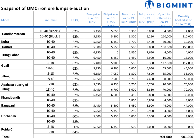 In OMC’s auction for 0.901 mnt of iron ore lumps (Fe 60-65%) on 19 Jul’25, 100% material were booked at INR 5,350-7,650/t, with premiums of up to 27% on base price. Weighted average bids rose by INR 175/t m-o-m. Earlier, the miner increased base prices by INR 150/t m-o-m for few lots. Strong demand was seen in auction for lumps amid the material shortage owing to heavy rainfall in eastern region.