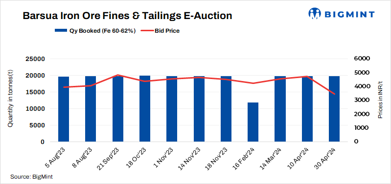 - SAIL-Barsua conducted an auction for 19,830 t of iron ore tailings (Fe 60.36%) in which the entire quantity was booked at INR 4,075/t against the base price of INR 3,475/t.