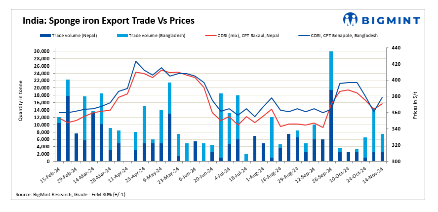 Sponge iron export prices increased by $7-18/t this week, to $371/t CPT Raxaul for Nepal and $379/t CPT Benapole for Bangladesh, driven by moderate buying interest on varying offers. However, buyers remained cautious, as demand for finished steel was relatively muted w-o-w. Deals of approximately 8,500 t of sponge iron were concluded, destined for Nepal and Bangladesh.