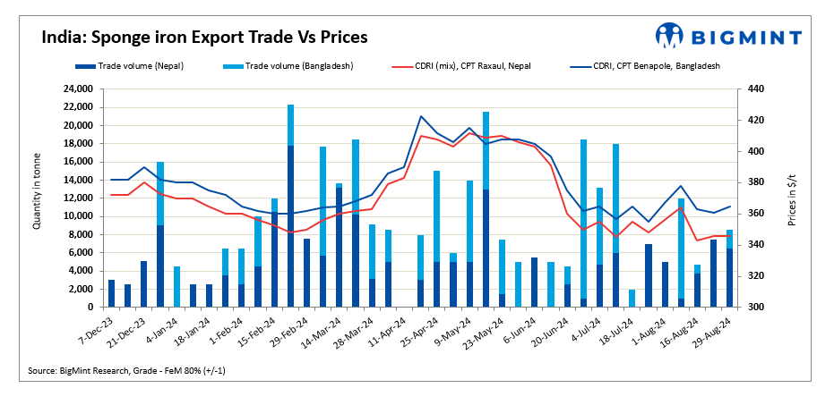 Sponge iron export offers for Nepal remained unchanged this week, with buying activity slightly improving between $345-$346/t CPT Raxaul. However, offers for Bangladesh witnessed a slight increase w-o-w, although buying demand from Bangladesh remained limited.