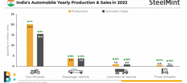 India’s total automobile production was recorded at 25.85 million units (MU) in calendar year 2022 (CY22), according to provisional data from the Society of Indian Automobile Manufacturers (SIAM) maintained by SteelMint. Production volume registered a 7.4% y-o-y growth compared to 24.06 MU in CY21.