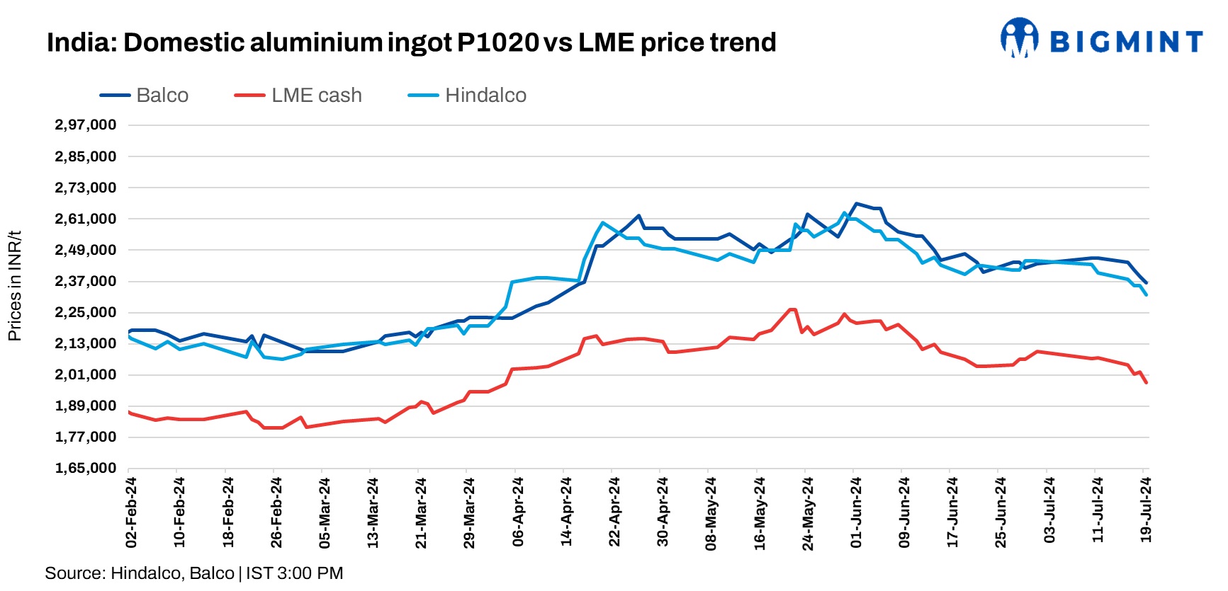 India’s primary producers have decreased aluminium ingot (P1020, 99.7%) prices by INR 3,750/t ($45/t) today in comparison with 17 Jul’24. Balco’s prices are at INR 232,750/t ($2,782/t) and Hindalco’s at INR 231,750/t ($2,770/t). All prices are ex-works and exclude GST. At the time of reporting, aluminium futures on LME stood at $2,368/t.