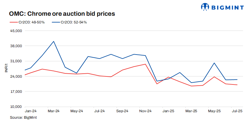 Odisha Mining Corporation (OMC) has scheduled an auction for 71,900 t of chrome ore on 19 Aug’25, with the offered volume down slightly by 1,200 t m-o-m. Parallelly, prices of all grades were raised by 1% (INR 50-293/t). The slight hike is likely due to the recent uptick in ferro chrome prices, which was fuelled by higher offers from suppliers amid limited material availability.