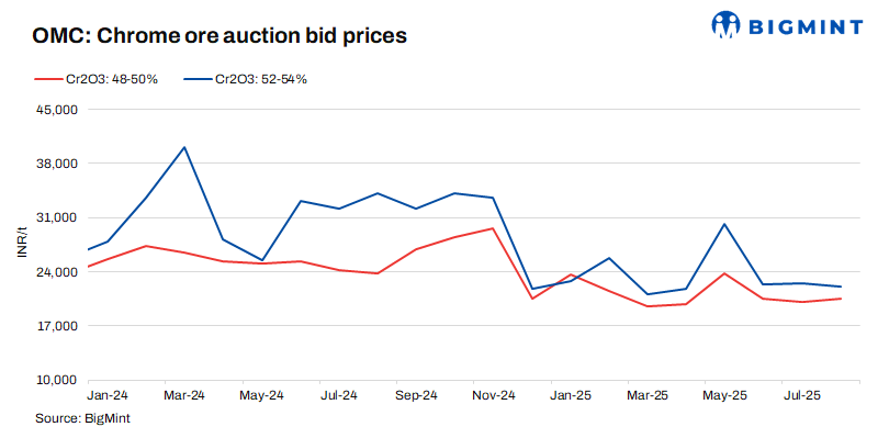 Odisha Mining Corporation (OMC) has scheduled an auction for 80,100 t of chrome ore on 19 Sep’25, with the offered volume rising by 8,200 t m-o-m. Base prices of all grades have been increased by 6-16% (INR 550-3,649/t). The hike is attributed to a surge in ferro chrome prices in Sep’25, by around INR 12,645/t m-o-m, driven by higher offers amid limited material availability.