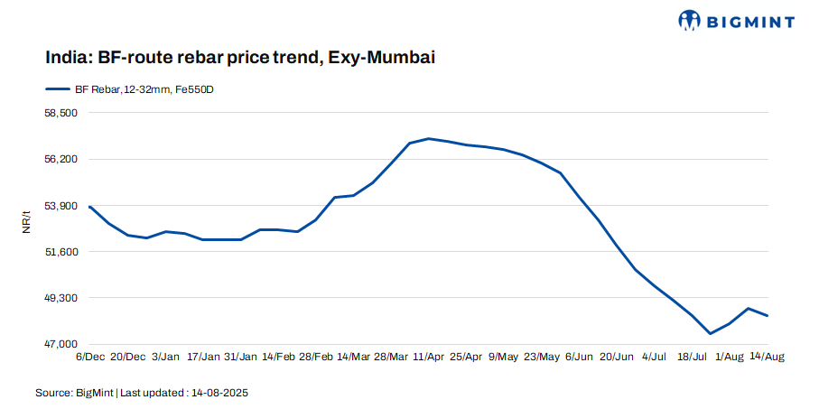 Trade-level BF rebar prices dropped by INR 400/tonne (t) ($5/t) w-o-w to INR 48,400/t ($553/t) exy-Mumbai, as per BigMint’s assessment on 14 August 2025. Prices are exclusive of GST at 18%.