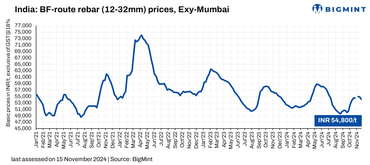 Trade-level blast furnace (BF) rebar prices edged down by up to INR 700/t ($8/t) w-o-w to INR 54,100/t ($641/t) exy-Mumbai, as per BigMint’s assessment on 22 November 2024. Prices are exclusive of GST at 18%. The price softening was on account of limited domestic demand and cautious buying sentiment.