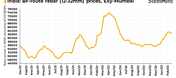 Trade level prices of rebars made through blast furnace (BF) -route dropped marginally by INR 200/t ($2/t) w-o-w in the key market of Mumbai. Current prices stood at INR 62,600/t ($756/t), exy-Mumbai as per the assessment on 24 February 2023. Prices are excluding 18% GST.
