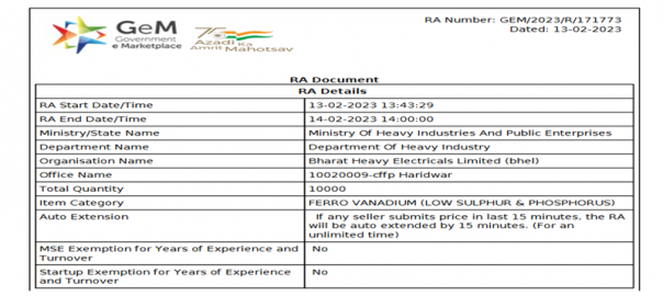 India: BHEL books 10 t of ferro vanadium at reverse auction