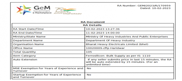 Bharat Heavy Electricals Limited (BHEL) concluded a reverse auction for 105 t of ferro silicon (Si:70% min, Size: 40-150 mm) on 10 Feb’23. The material was booked at around INR 158,304/t FOR, inclusive of all taxes. Excluding GST and GEM portal charges, prices are at around INR 133,489/t FOR, sources informed.