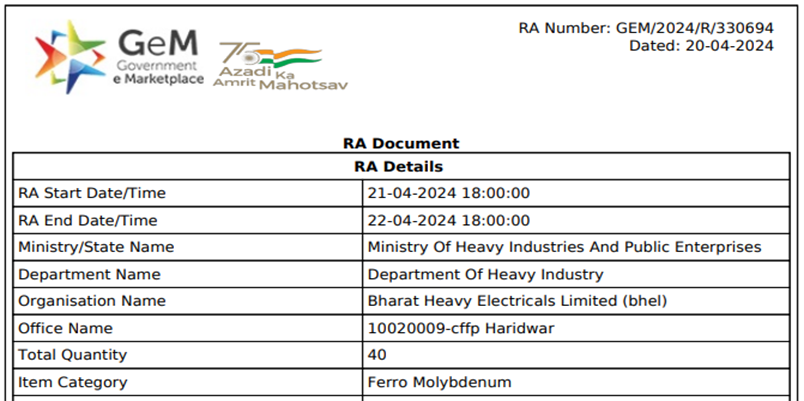 Bharat Heavy Electricals Limited (BHEL) conducted a reverse auction for 40 t of ferro molybdenum (Mo: 60% min, 10-50mm) on 22 Apr’24 for its Haridwar-based unit. The entire material was booked with the L1 price at around INR 26,33,000/t FOR (including GST and GEM portal charges), as per sources.